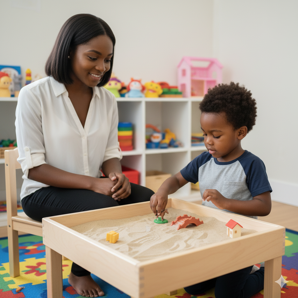 A trained play therapist uses toys, art, games, stories, and creative activities to help children explore emotions, solve problems, and develop coping skills in a safe, supportive environment.